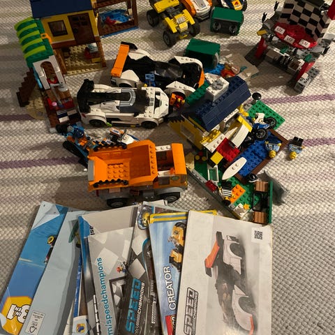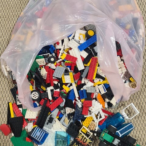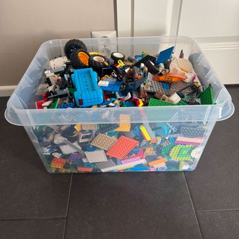 Laatikollinen erilaisia palikoita. Vähintään 5kg. Keittiövaa'assa loppui asteikko. Olen kuviin muutaman kerran kuopaissut. Joukossa satunnaisia ukkojen osia. Hyvällä tuurilla mukana Minecraft tai Star Wars- palikoita, mutta varmaksi en voi luvata.