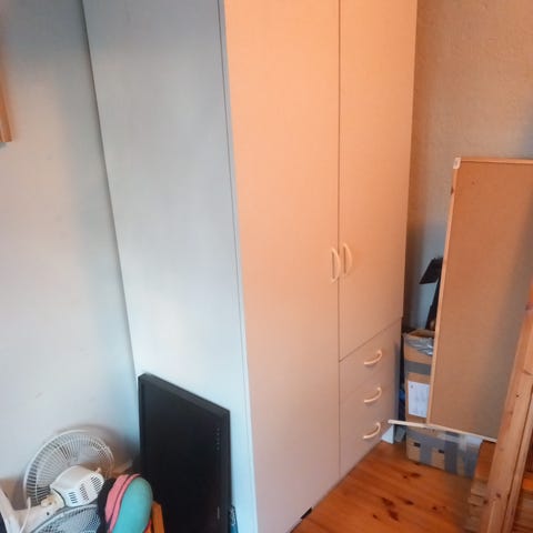 Annetaan puuovilla varustettu vaatekaappi, jossa liukuvat ovet. Vaatekaappia pystyy käyttää myös matalemmassa tilassa koska ylä osa helposti irrotettavissa. Vaatekaappi on nyt valmiiksi purettuna osiin.