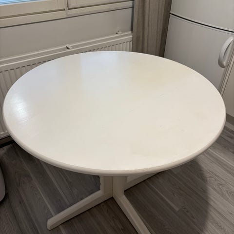 Täyttä puuta. Pyöreä pöytä. Jalat maalattu mustaksi.