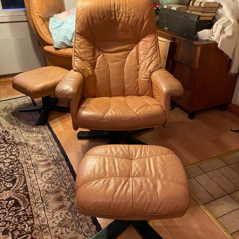 Mustapintainen nahkainen nojatuoli ja siihen kuuluva rahi. Nojatuolissa on pyörivä pyöristetty jalusta. Tuoli ja rahi ovat mustaa nahkaa ja niissä on pehmustetut istuin- ja selkäosat.