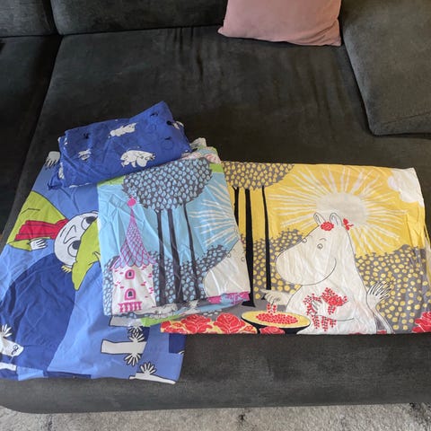 Ehjä, käytetty kuvan pussilakana- ja tyynyliinasetti juniorkoolla. Pesty hajustamattomilla pesuaineilla. Taloudessa satunnaisesti vieraillut koira.