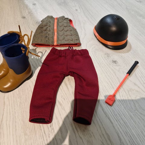 Mukana: Heppa koru.Pehmustettu liivi brodeeratulla logolla . Ruudullinen paita. Valkoiset ratsastushousut ja laivastonsiniset ratsastussaappaat.