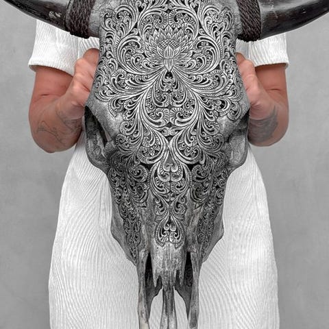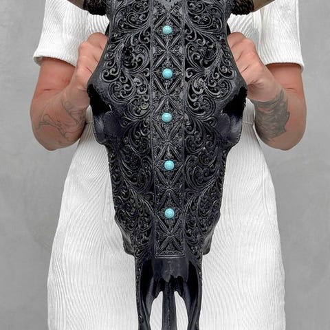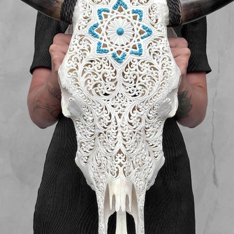 Suuri käsin kaiverrettu härän kallo, jonka ovat kaivertaneet taiteilijat, jotka ovat siirtäneet muinaisen kaiverrustaidon isältä pojalle. Kallo on täysin käsin veistetty suurella huolella. Se on epätavallinen, koristeellinen kappale.