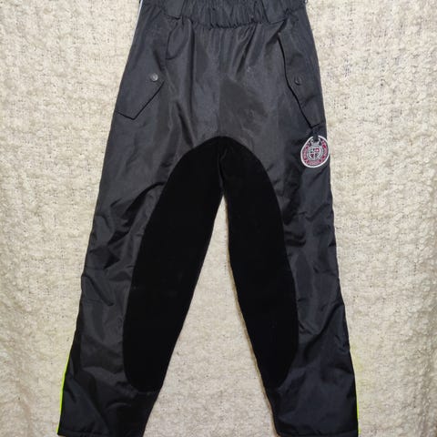 Mustat topparatsastushousut, joissa on heijastinraidat sivuilla. Housuissa on vetoketjut lahkeensuissa. Housuissa näkyy käytön jälkiä ja kulumaa. Mukavat ja pehmeät jalassa, olleet paljon käytössä.