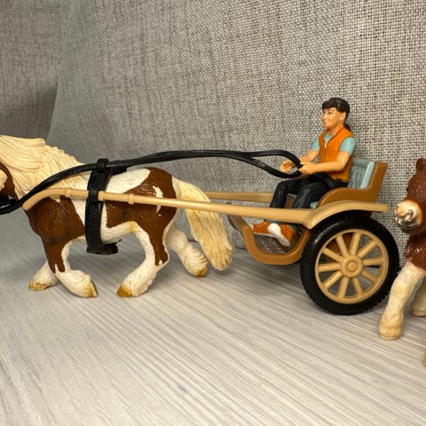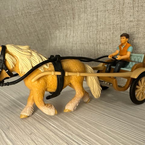Vahmemman malliset Schleich ponikärryt, mukana shetlanninponi tamma, kuljettaja Riikka ja suitset sekä ohjaimet. Harvinainen kokonaisuus! Vuosiluku ponissa 2004. Kärryt ja poni kuin uudet, kuljettajassa maalikuluma hiuksissa.