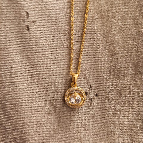Kaunis kullanvärinen kaulakoru zirkoneilla. Ruostumatonta terästä. Myytävänä myös muualla.