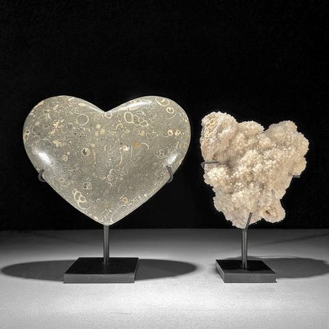 Upea pari turritella-muotoista munanmuotoista ja kristallikuutio-kalsiittia räätälöidyillä jalustoilla.
