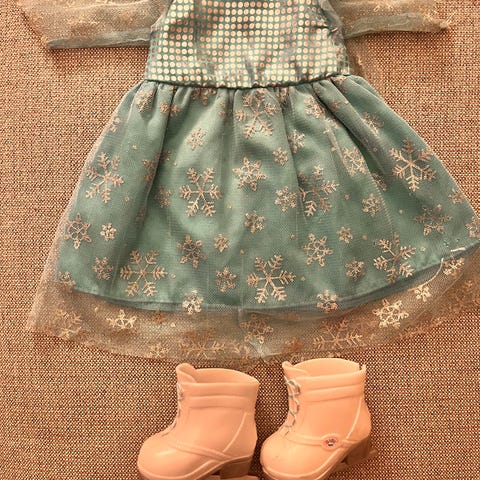 Baby Born nuken mekko, jossa pienen patterilla toimivat led-valot. Mekossa on hihat ja koristeellinen vyötärönauha. Vasemmassa hihassa repeymää.