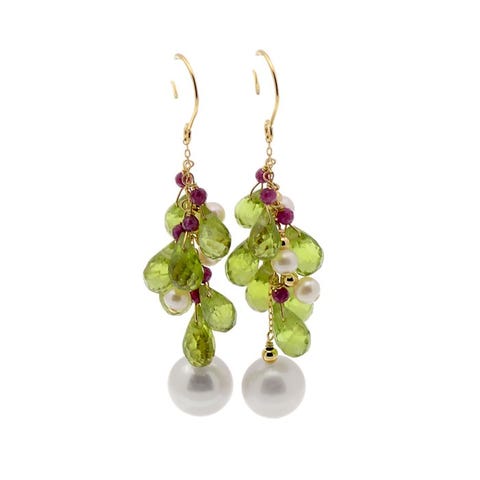 18K / 750 keltakultaiset korvakorut Akoya-helmiä, makeanvedenhelmiä, opaalia ja rubiinia