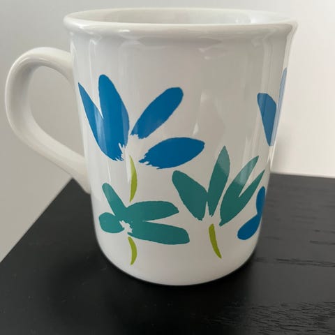 Arabia sesonki Muki, jossa vihreä kuusi-kuviointi. Keraaminen materiaali, valkoinen pohjaväri ja vihreät kuusikuvioinnit.