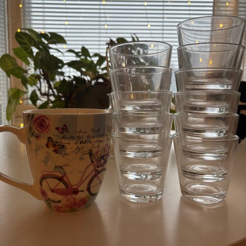 Kolme kirkasta ja yksi harmaa. Harmaassa ei tarraa ja yhdessä kirkkaista pieni särö (kuvassa).