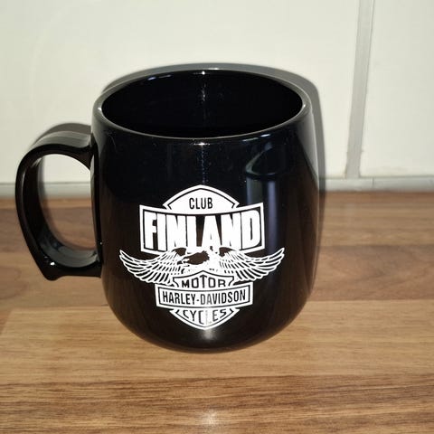 Harley Davidson muki. Korkeus 16cm, halkaisija 8.5cm. Kannessa auki/kiinni osa. Uusi.