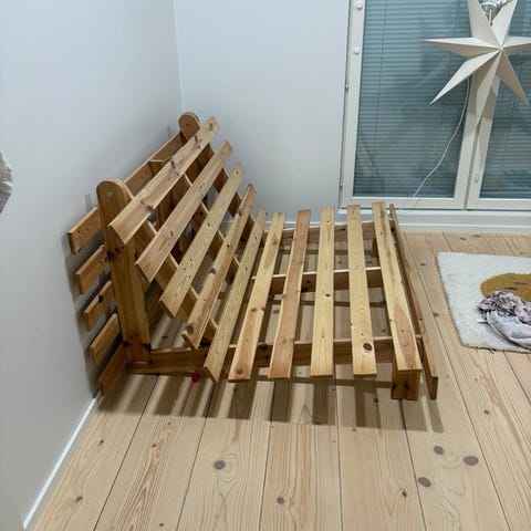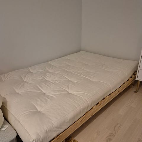 Karup designen kiinteä / kova perinteinen futon patja pellavaisella päällisellä. Pieniä tahroja ja peppujen kohalle tulleet kuopat, mutta toimii vallan mainiosti day bedinä tai vierasvuoteessa. Huolellisella rullaamisella voi saada tasaisenkin vielä.