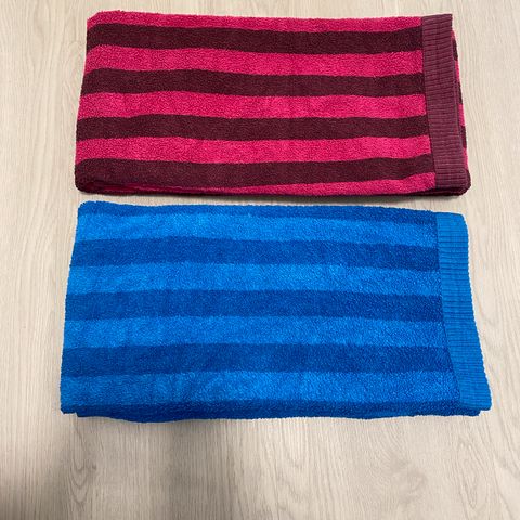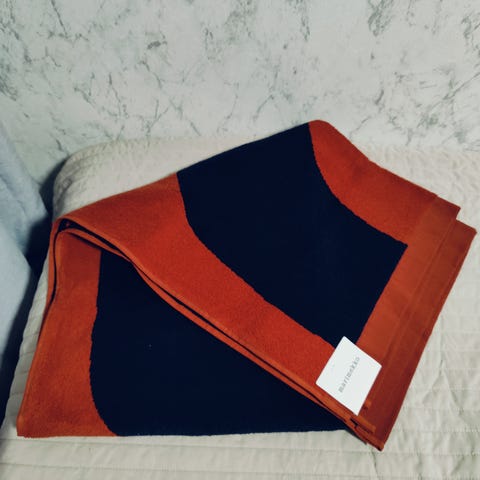Marimekon uusi sini-valkoinen froteepyyhe. Laput kiinni.