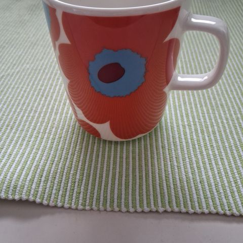 Marimekko oiva unikko 2,5dl muki. Voi käyttää mikroaaltouunissa, kestää pakastamisen ja on astianpesukoneen kestävä.