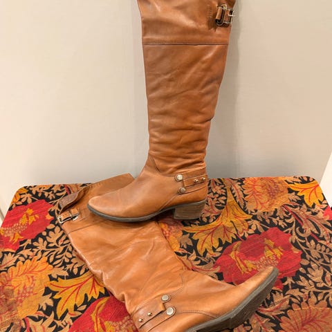 Hyväkuntoiset ruskeat nahkasaappaat. Nilkan kohdalla ollut koriste, sen takia vaaleampi kohta nilkassa. Kuvassa väriero näyttää isommalta, kuin luonnossa.