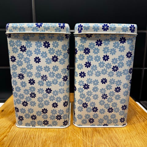 Suomalaisen GWS:n valmistamat sinikukalliset peltipurkit, 2 kpl, joilla on jo ikää, mutta kunto on erittäin hyvä, niissä on vain pieniä käytön jälkiä. Toisen purkin sisäkansi on tummentunut beigeksi, mutta purkki on täysin käyttökelpoinen.