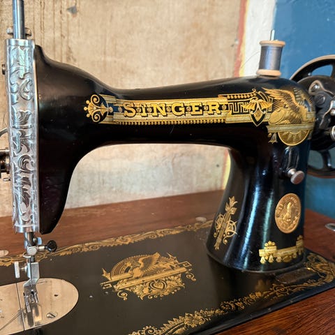 Vanha singer ompelukone poljettava. En tiedä toimiiko koska hihna puuttuu.