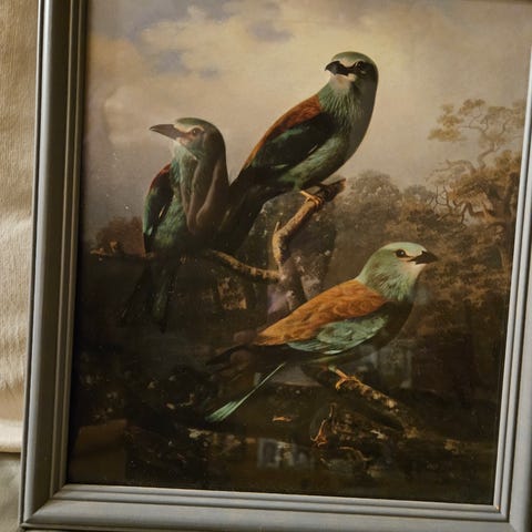 Kehystetyt taulut lasin alla ehjät raamit (siniharmaa ja ruskea/kultaraita)/kuvat von wrightin maalauksista/jouhisorsa ja kyyhkysiä? Molemmat kerralla. Kuopio Pilkälahti.