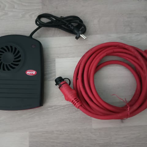 Muutamaa erilaista moottorin lämmitysjohtoa, sisäilmapuhallin, tunkki