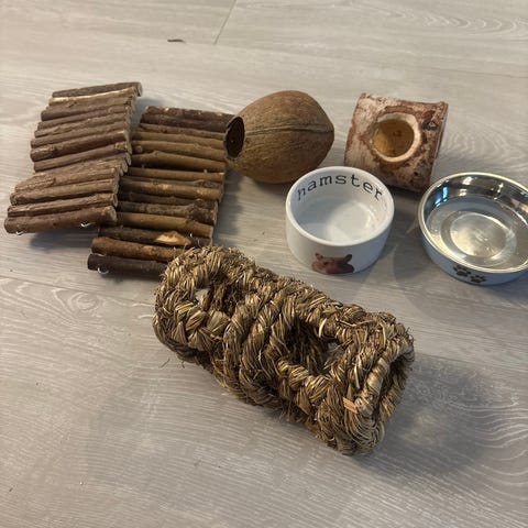 Ruokaa, pesäkuitua, erikoishiekkaa, hökkeli ym.