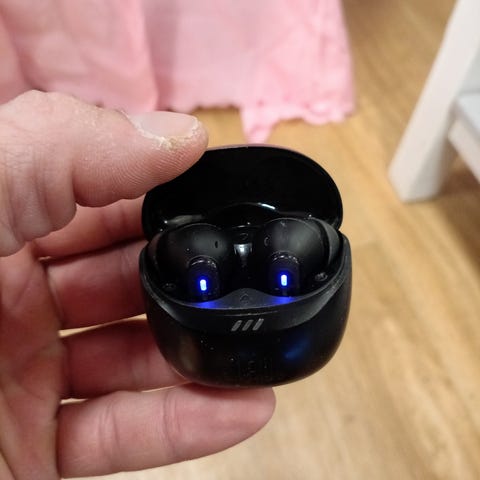 Avaamattomat JBL Tune Flex kuulokkeet valkoisena. Ominaisuuksiin kuuluu aktiivinen melunvaimennus, Pure Bass -ääni ja 32 tunnin akunkesto kotelossa ladattuna. Kuulokkeet tukevat handsfree-puheluita ja niissä on mukautettava istuvuus eri korvan kokoihin.