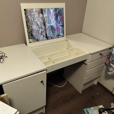 Siisti työpöytä. Ollut meikkipöytänä ja kuvan peili myös mahdollisuus hankkia. Pöytä 40 €, peili 20 €
