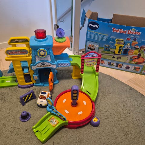 Toot-Toot Drivers poliisisema, valmistaja Vtech. Kaikki osat tallessa, myös käyttöohje. Alkuperäistä pakkausta ei ole enää, ainoastaan osa leikattu talteen kokoamista helpottamaan. Autot täysin toimivia, patterit poistettu säilytystä varten. Ehjä ja toimiva. Hyvin lievää käytönjälkeä kuten radan osissa naarmua ja irto-osien tarroissa kulumaa, hiukan pölyä säilytyksestä. Huom! Valkoinen kilpa-auto ei kuulu settiin, mukana tulee poliisiauto ja ambulanssi. Koiratalous. Postitus Toridiilin kautta tai nouto Vihti Nummela. Myös muita sarjan settejä myynnissä.