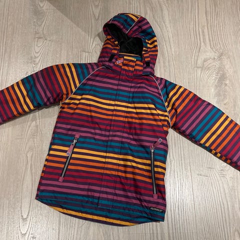 Villervallan toppatakki tarjolla seuraavalle. Koko 134, yhden lapsen käyttämä. Normaalia käytön jälkeä ja pinttymää paikoitellen (kts. kuvat). Ominaisuudet kuitenkin kohdallaan, tuulen- ja vedenpitävä ja hyvää Villervallan laatua.