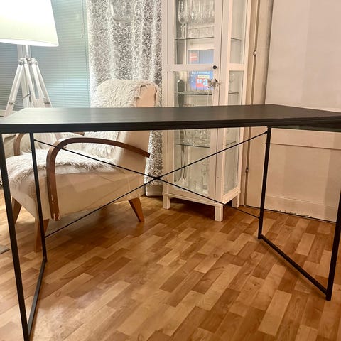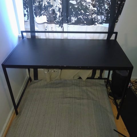 Jysk Tistrup mallinen työpöytä. Pöydän pinnassa pinttynyttä tahraa, ei ole kokeiltu vahvemmilla aineilla poistaa. Saa kuitenkin piiloon esim. Ison alustan avulla. Muut osat kunnossa. Ovh 79e.