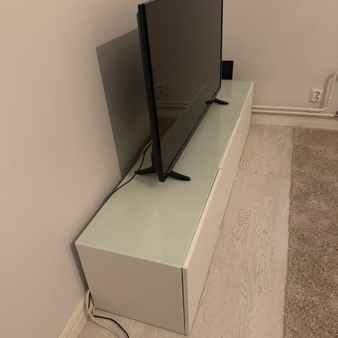 Valkoinen Ikean Bestå-tv-taso, jossa korkeakiiltoiset ovet ja lasinen päällinen. Vasemmanpuolimmainen kaappi on jaettu yhdellä hyllyllä, keskimmäinen on laatikko ja oikeanpuolimmainen on täysin avoin kaappi. Takana on aukko johdoille. Näillä spekseillä uutena n. 220e.