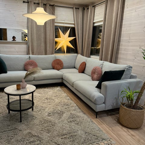 Myydään ulkomaille muuton takia. Ihana ja mukava sohva, mutta joitakin pieniä käytönjälkiä on. On kuitenkin hyvässä kunnossa! Leveys noin 260cm, istumakorkeus 32cm ja kolmasta syvyys 160cm ja toisella puolella syvyys 105cm.