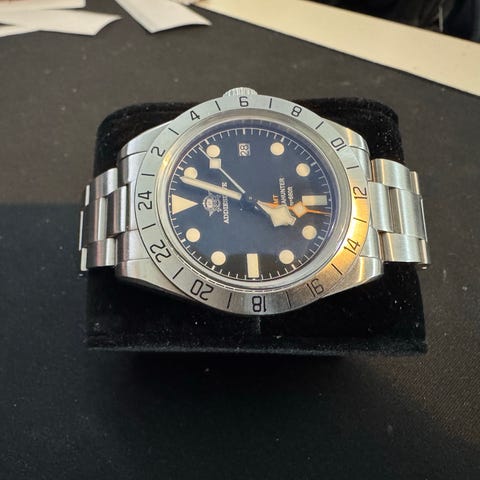 Hyväkuntoinen ja tarkkakäyntinen kello Seikon NH34 -koneistolla. Ohuempi kuin Tudorin alkuperäinen malli! Rannekkeessa pintanaarmua.