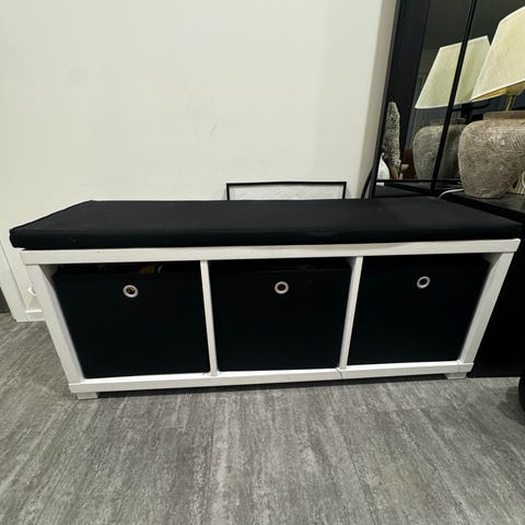 Myydään Askosta ostettu penkki. Leveys 90 cm, korkeus 46 cm, syvyys 33 cm. Alla kaksi säilytyslaatikkoa