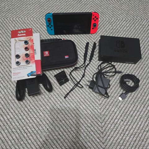 Nintendo Switch Oled pelikonsoli, jossa on neonpunaiset ja neonsiniset Joy-Con ohjaimet. Mukana alkuperäinen latauskaapeli, kaksi lisä Joy-Conia yksi erillinen ohjain, telakka ja kaksi peliä super smash bros ultimate sekä Naruto x Boruto ultimate ninja storm connections