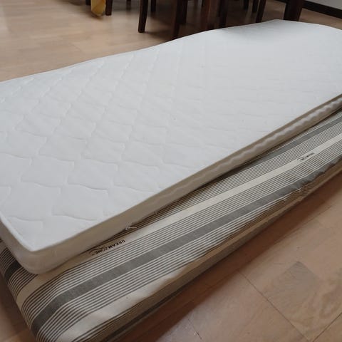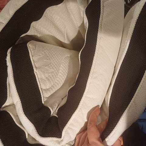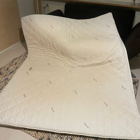 Muutaman vuoden käytössä ollut 160x200cm petauspatja. Ok kunto. Patjassa värjäymä muutosta tullut kun osunut johonkin autossa (näkyy kuvassa). Käsitelty desinfioivalla puhdistusaineella.