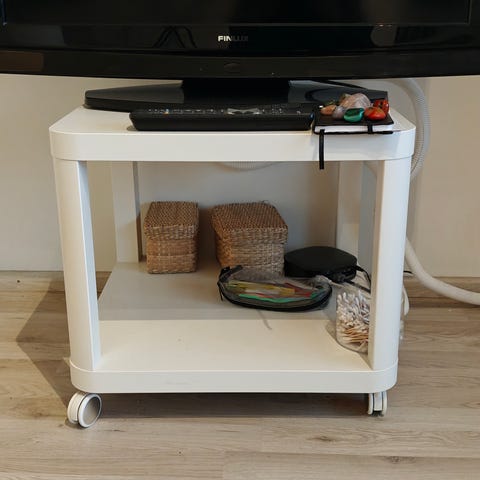 Kiiltovalkoinen Jyskin apupöytä. Erinomaisessa kunnossa