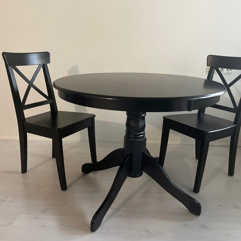 Pyöreä ruokapöytä, jossa on musta saarniviilusta valmistettu pöytälevy ja yhteensopiva musta teräsrunko. Pöytälevy on lakattu, mikä tekee siitä kestävämmän. Ø100 x K75 cm