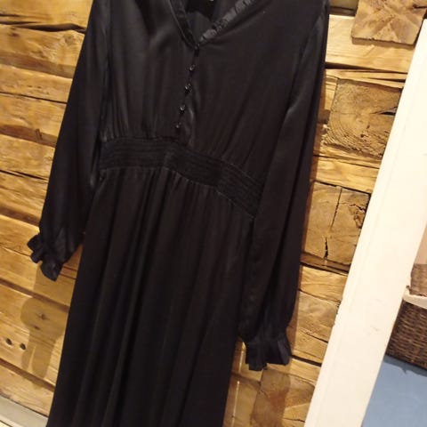 Musta mekko. Koko L. pehmeästä viskoosimateriaalista. Tässä mallissa on pitkät hihat ja drapeerauksia.