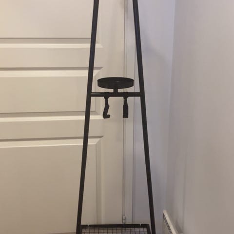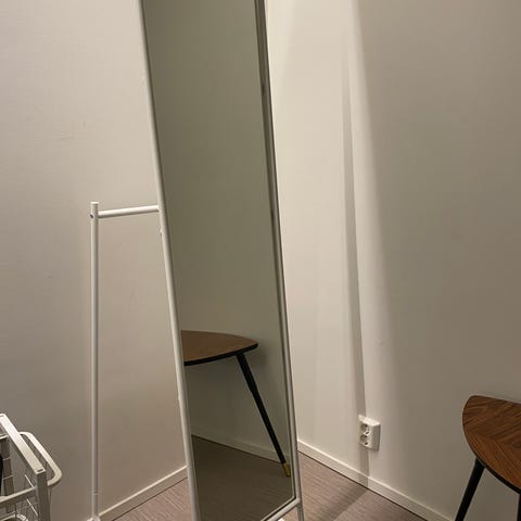 IKEA Knapper peilillinen vaateteline valkoisella rungolla. Telineessä peili ja koukut vaatteiden ripustamiseen. Sopii kodin tai työtilan käyttöön vaatetelineenä ja peilinä.