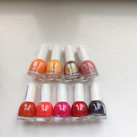 Lähes täydet pullot kynsilakkaa, valkoinen (Aieenior) ja nude (Yes Love). Lisäksi kynsikkäät, kynsilakanpoistoainepyyhkeitä (yksittäispakatut, jäljellä 6 kpl), kimalteita ja koristetarroja kynsiin.