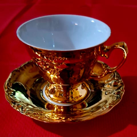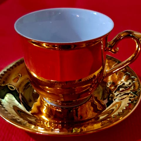 Kupin halkaisija 6,5cm ja korkeus 6cm. Tassin halkaisija 13cm, korkeus 2cm. Posliinia.