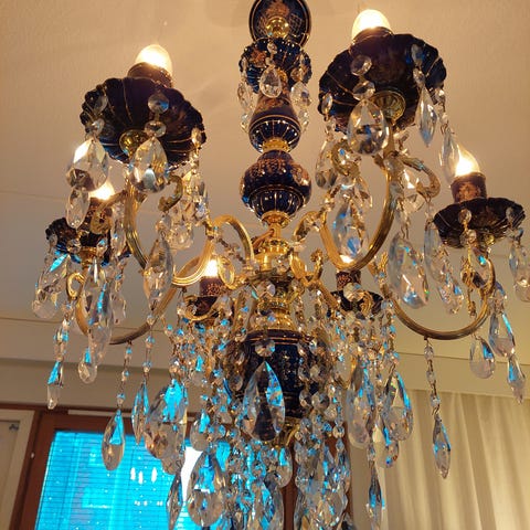 Moderni kristallikruunu eli kattovalaisin kromirungolla ja kuudella lampulla.