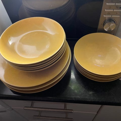 Toisesta isosta lautasesta lohjennut pieni palanen, näkyy kuvassa.