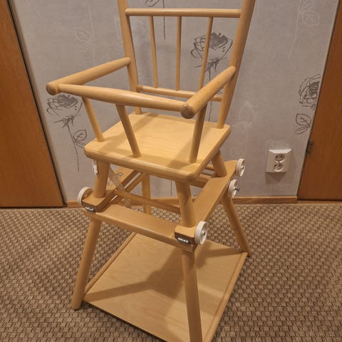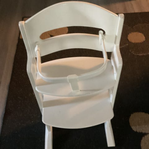 Stokke Syöttötuoli on valkoinen lasten syöttötuoli, joka on säädettävissä lapsen kasvaessa. Tuolissa on tukeva rakenne ja säädettävät istuin- ja jalkatuet, jotka tarjoavat mukavuutta ja turvallisuutta lapselle ruokailun aikana. Jostain kohdin maali on kulunut.
