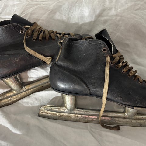 Talviset puiset vintage luistimet koristeeksi. Koko noin 30x30cm.