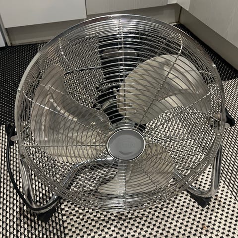 Vain muutaman tunnin käytetty, tyylikäs, kromin värinen lattiatuuletin isoonkin tilaan.