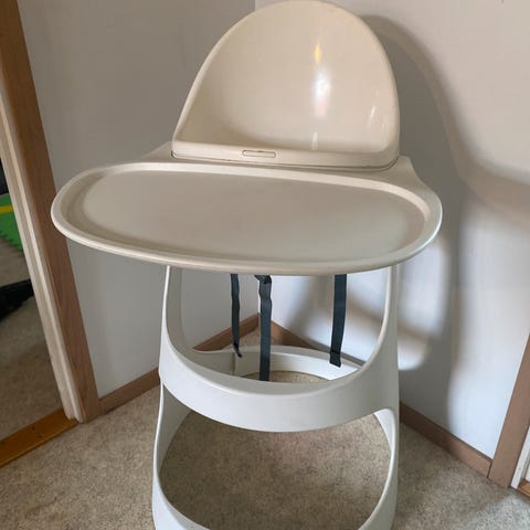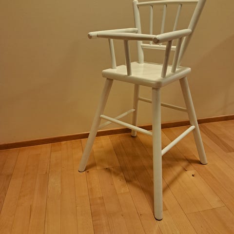 Perinteinen syöttötuoli, jonka saa myös pyörillä kulkevaksi. Ollut käytössä jo monella lapsella, joten pinnoissa on ajan patinaa. Voi maalata uudelleen, jos haluaa.