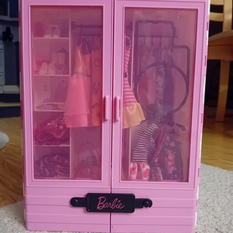 Aikuinen Barbie, lapsi ja hevonen. Vaatekaappi täynnä vaatteita ja asusteita.