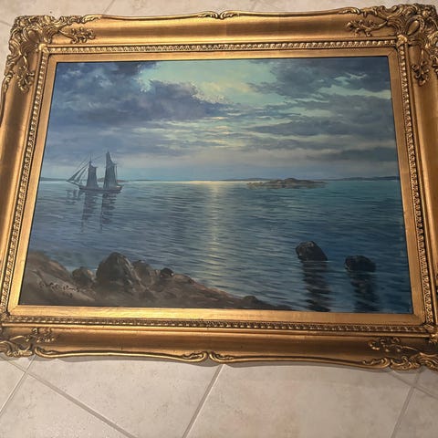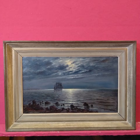 Alexander Wilhelmsin, tunnetun taitelijan maalaus, jossa on merimaisema. Teos on kehystetty koristeellisella kehyksellä. Maalauksen alaosassa on taiteilijan signeeraus ja vuosi 1930. Takapuolella on kiinnityslanka ripustamista varten. Itse taulussa on naarmuja ja pintarikkoja, ks. kuvat tarkasti. Myös kehyksessä on halkeama (ks. Myös kuva). Koko 67x80cm. Taulu myydään tässä kunnossa, kunto huomioitu hinnassa.